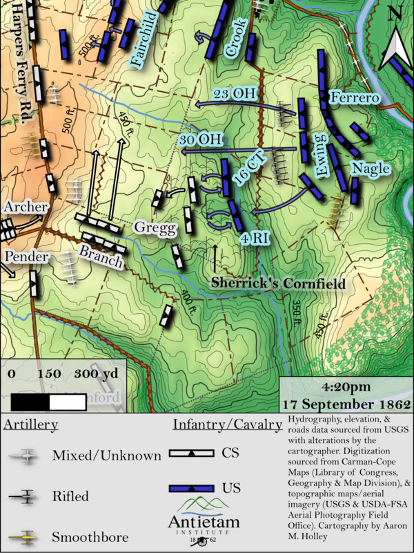 - Map depicting action in and around Sherrick’s forty-acre cornfield at approx. 4:20pm, 17 Sept. 1862.