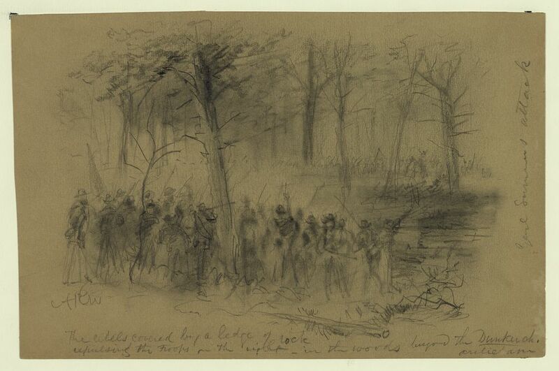 - The rebels covered by a ledge of rock repulsing the troops on the right- in the woods beyond the Dunker ch.