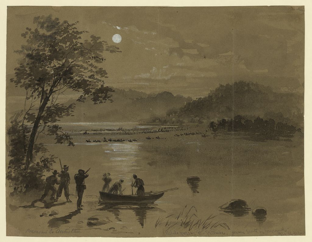 - Waud's depiction of Union scouts watching Confederate soldiers crossing the Potomac River