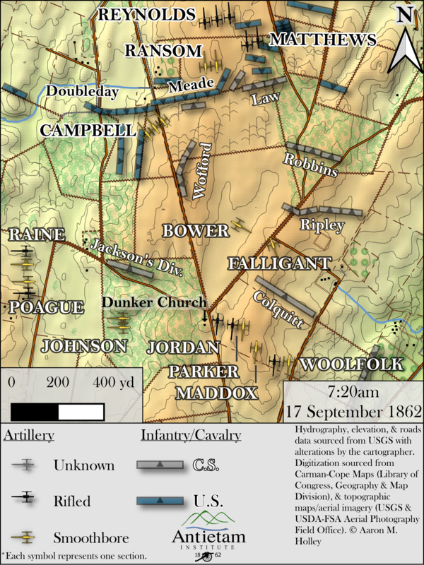 - Map depicting action in and around Dunker Church north to the Cornfield at approx. 7:20am, 17 Sept. 1862.