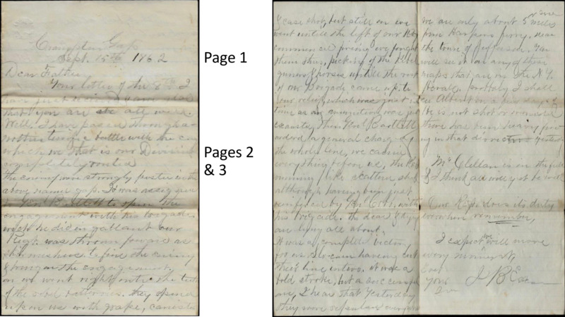 - This document contains two letters The first recounts the events of Cramptons Gap. The second mentions the stench of rotting bodies after the Battle of Antietam and asks the recipient about family matters. This item includes an image of original letter, a transcription, and one other soldier mentioned