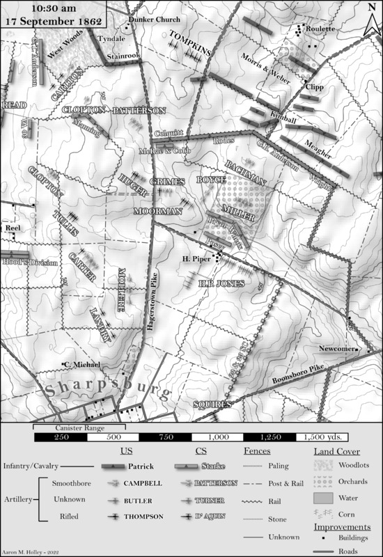 Map depicting action of Simon's (Bachman’s) Battery in position near the Sunken Road, 10: 30 a.m. 17 Sept. 1862.