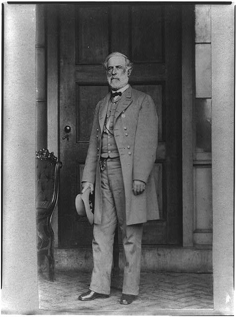 - A full-body portrait photograph of Confederate General Robert Edward Lee in uniform